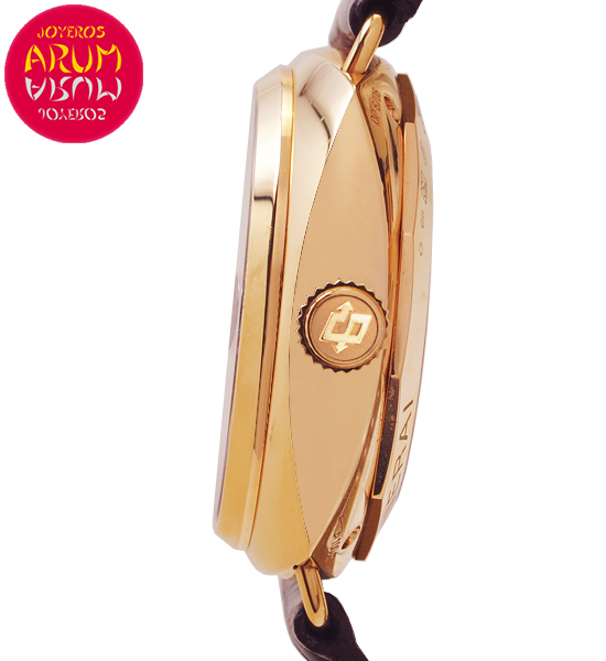 Other specifications :calibre P2003, power reserve 10 days, power reserve indicator, GMT, am/pm, date at three, small seconds at nine, luminous marks, transparent caseback, 18K gold folding clasp. Year 2008.