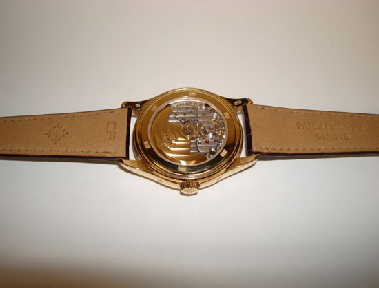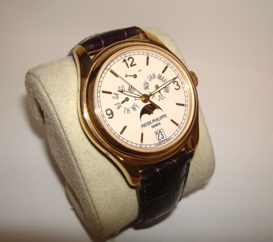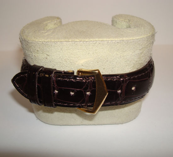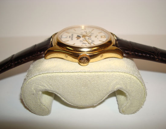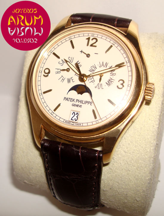 Description :yellow gold, cream sphere, sapphire crystal, automatic movement, weekday indicador, month indicator, moon phase, power reserve indicator at twelve, date at six o’clock, center seconds, luminescent handles, screw crown , 36 jewels, caliber 315 S IRM QA LU, transparent caseback with sapphire crystal, brown leather strap, gold folding clasp.