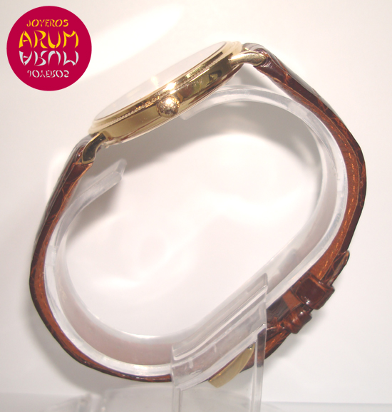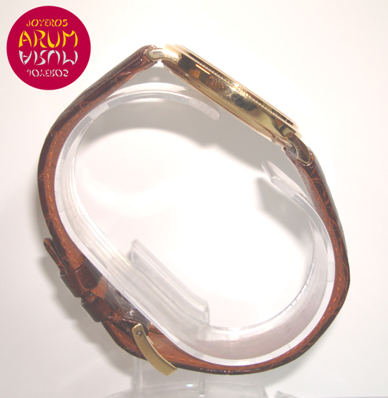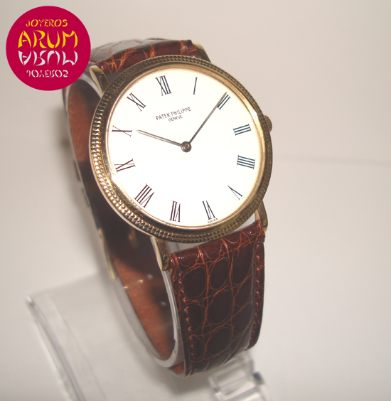 Description :yellow gold, white dial with roman numbers, bezel “Paris nails”, sapphire crystal, quartz movement, diameter 33 mm, waterproof 30 meters, brown leather strap, original gold Patek Philippe buckle.