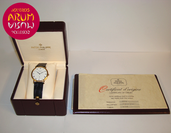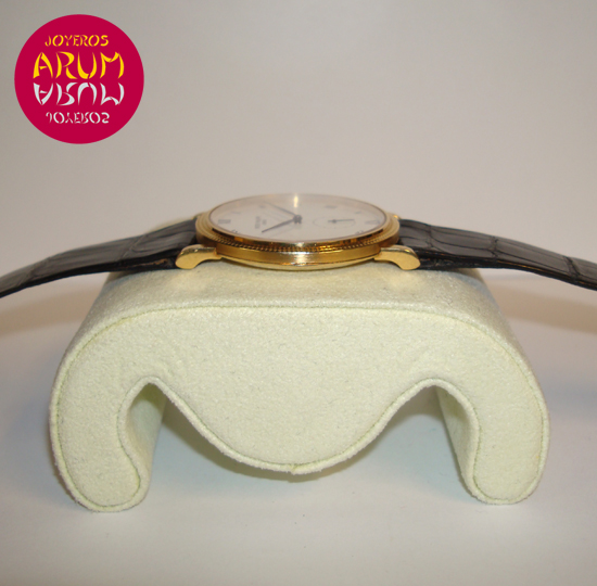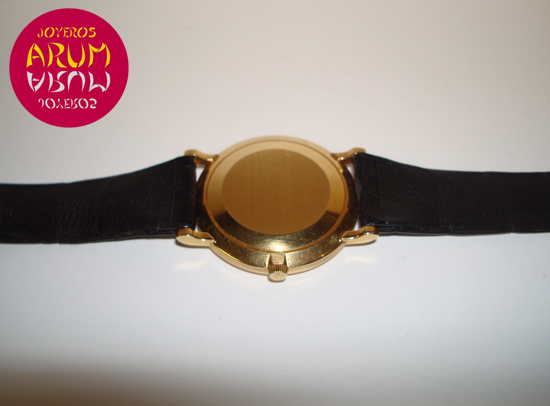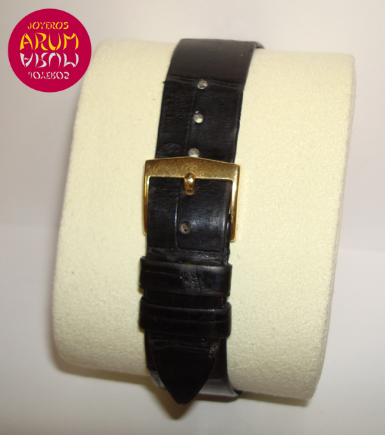 Description :yellow gold, white dial with roman numbers, sapphire crystal, hand winding movement, caliber 2155, small seconds at six, 33 mm diameter, black leather strap, buckle closure, year 1990.