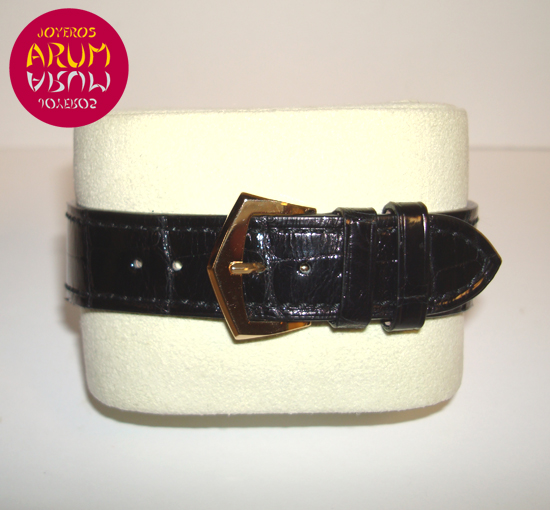 Description :yellow gold, white dial with Roman numbers, bezel decorated “Paris Nails” hand manual movement, caliber 215 PS Aig.2, small seconds at six, 36 mm diameter, transparent caseback, black leather strap, buckle closure original gold Patek Philippe, year 2008.