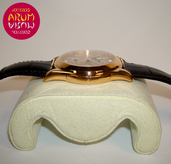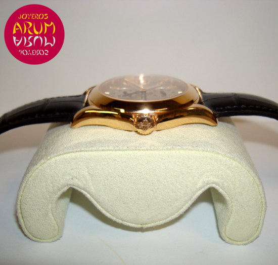 Description :rose gold, white dial, sapphire crystal, manual mechanical movement, caliber 215 PS FUS 24H AIG.1, auxiliary handle that indicates a second time zone, small seconds at six, 24 hour display am / pm at nine, screw crown, diameter 36 mm, waterproof 25 meters, transparent back with sapphire crystal, black leather strap, rose gold folding clasp, year 2008.