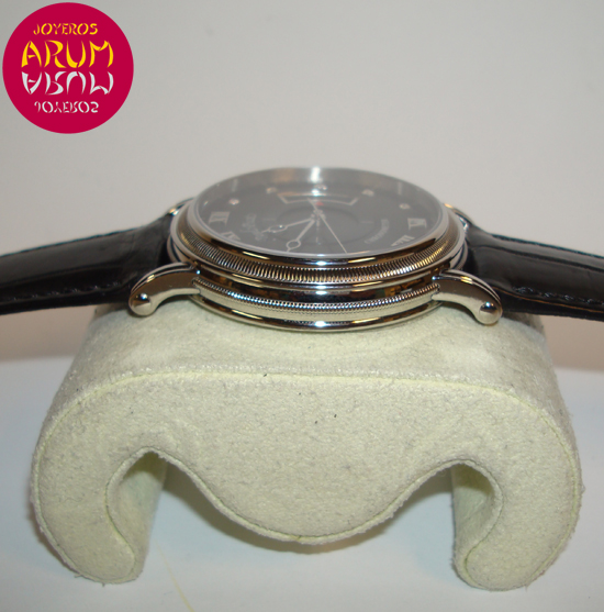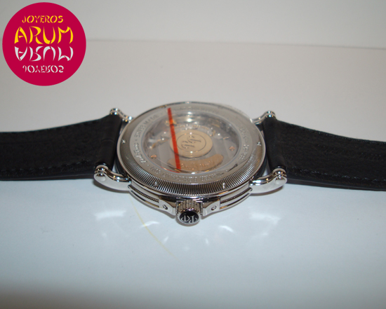 Description :steel, gray dial and black, roman numerals and brilliants on the dial, sapphire crystal, automatic movement, central second, date display, screw crown, transparent caseback, 41 mm diameter, 50 meters underwater, leather strap, closure steel folding.