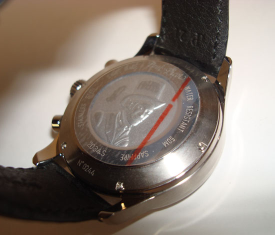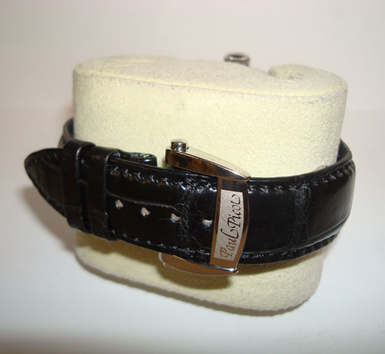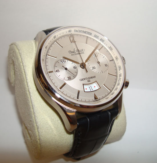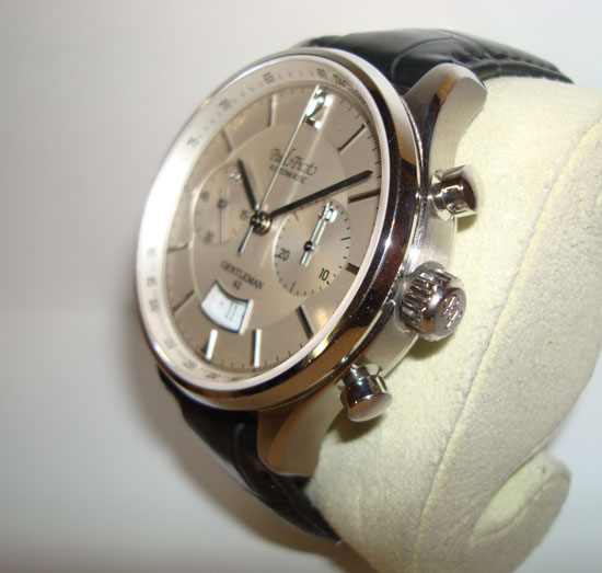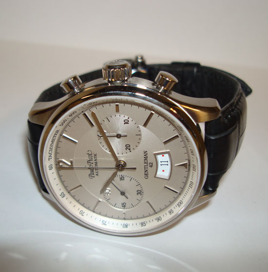 Description :steel, silver dial, sapphire crystal, automatic movement, chronograph, two indicators on the dial, seconds and minutes, date at six, 42 mm diameter, water resistant 50 meters, screw crown and two buttons, black leather strap, steel folding clasp.
