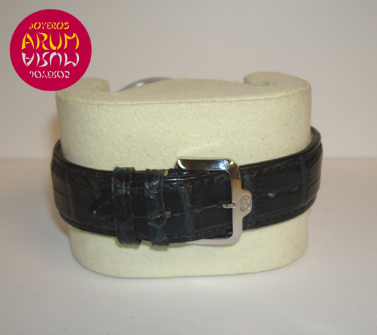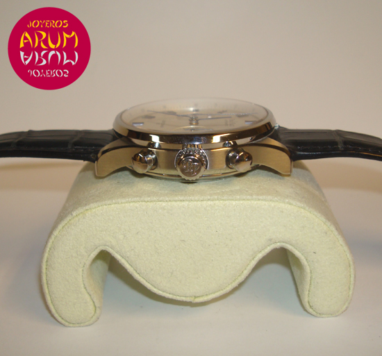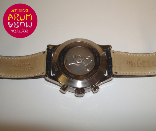 Description :steel, white dial with roman numbers, sapphire crystal, automatic movement, blue steel hands, chronograph, two indicators on the dial, small seconds and chrono minute indicator, crown and two buttons to the right, 42 mm diameter, water resistant 50 meters, leather strap, buckle closure, year 2011.
