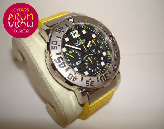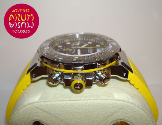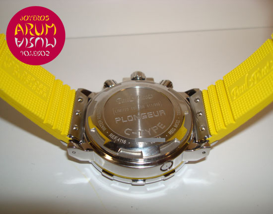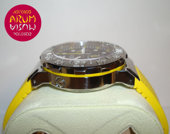 Description :limited edition of 999 pieces, steel, bezel with numbers and luminescent indicator, dial grid, antiglare sapphire crystal, automatic movement, 3 indicators on the dial, small seconds, chronograph, chronometer, luminescent handles, diameter 43 mm, water resistant 300 meters, screw crown with rubber yellow, yellow rubber strap, steel folding clasp.