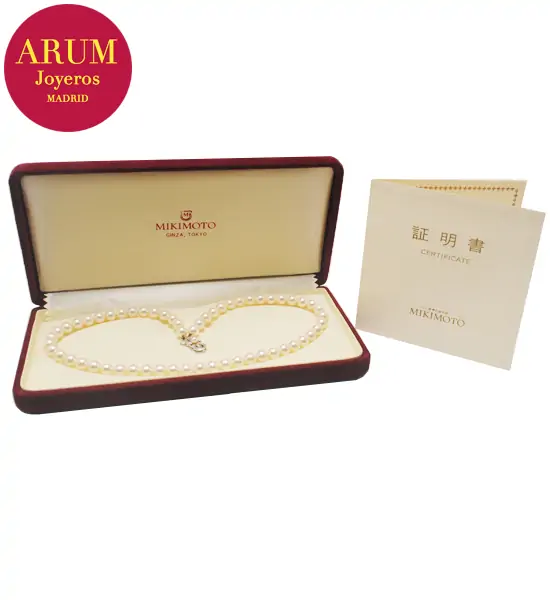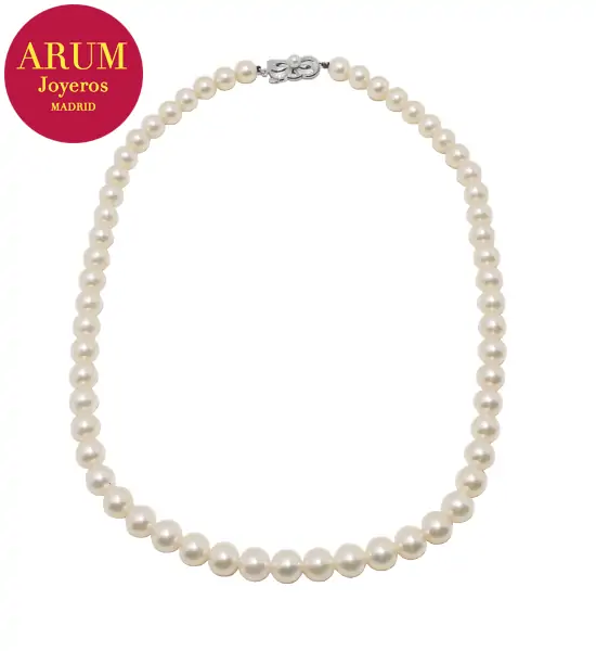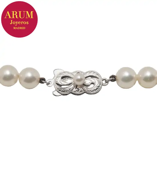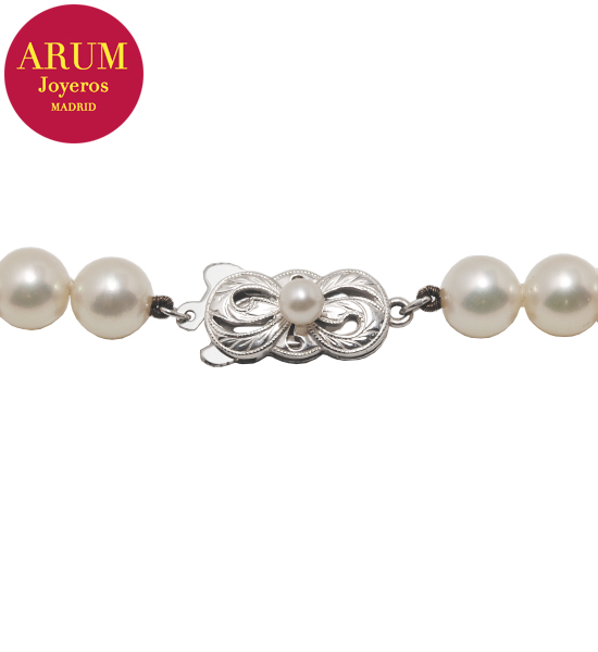 Description: Mikimoto pearls necklace. The necklace hace 57 pearls (7.0-7.5 m/m aprox), clasp is made in 14K white gold. Size are 40 cm.