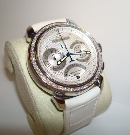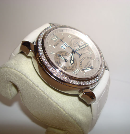 Description :steel, sapphire crystal, automatic movement, 64 diamonds, 1.28 carats, Top Wesselton, purity Vs, diameter 41 mm, Chronograph, hours, retro, small seconds, date, luminescent, transparent back cover, white leather strap, folding clasp steel.