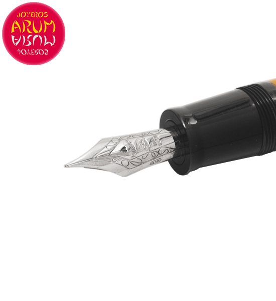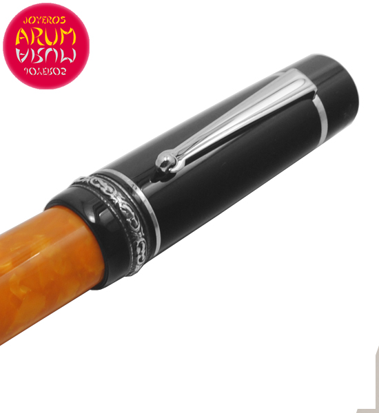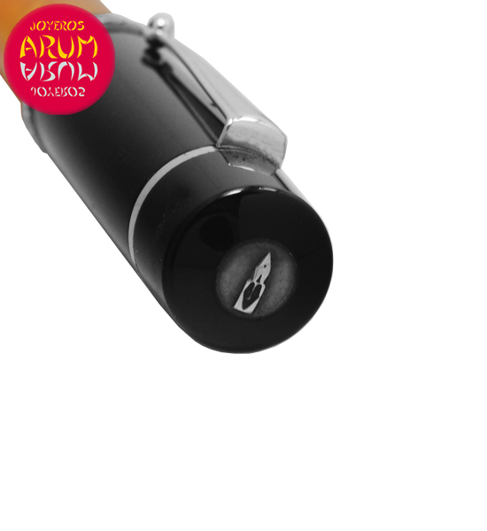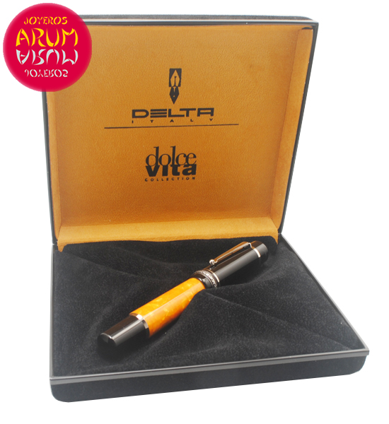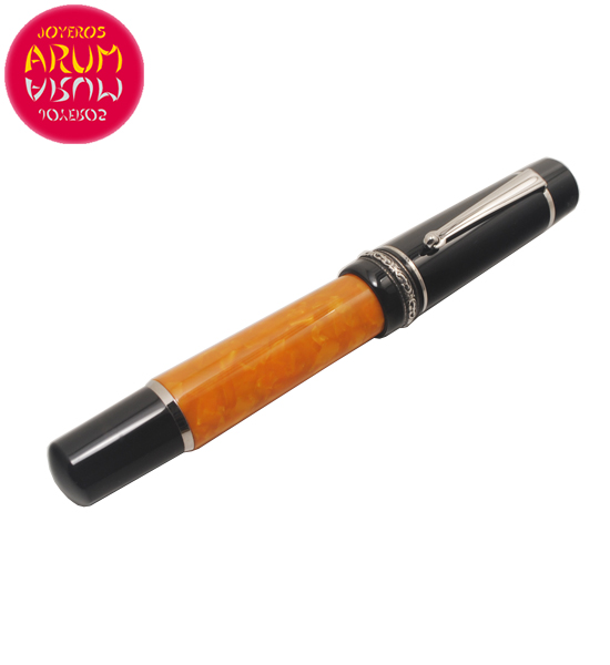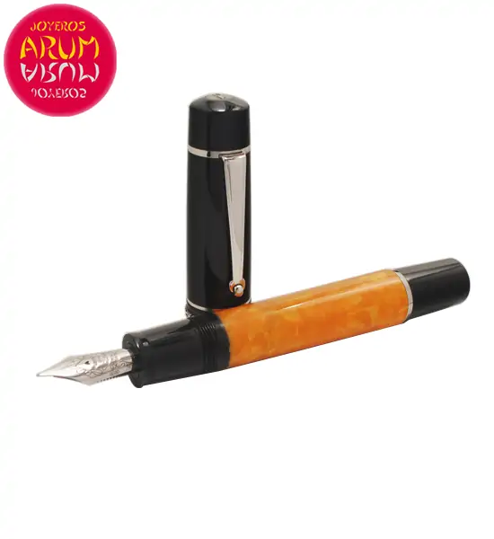Description: Fountain Pen of the prestigious Delta firm belonging to the Dolce Vita collection, made in hand turned orange celluloid and black resin with metal and silver details. Charging system with universal cartridge or converter. 18K gold nib. The size of the fountain pen is 13.5 cm.