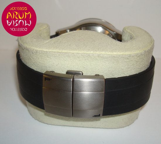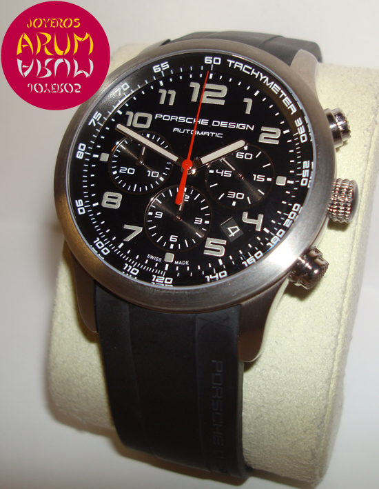 Description :titanium, black dial with arabic numerals, sapphire crystal, automatic movement, chronograph, three indicators on the dial, seconds, minutes, hours, date between four and five, luminiscence, two buttons and screw crown, diameter 42 mm, rubber strap, titanium folding clasp.