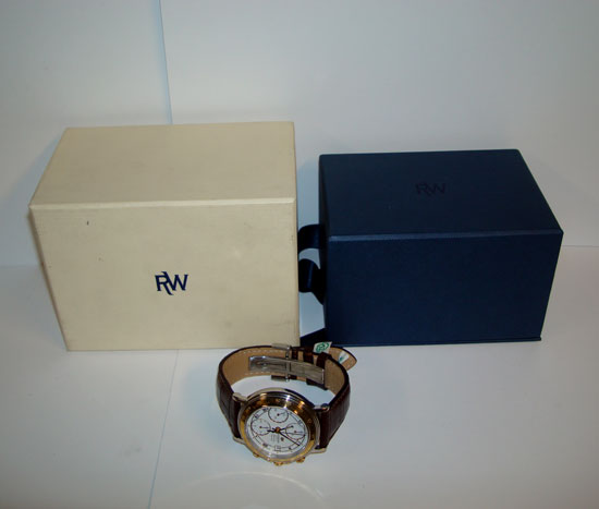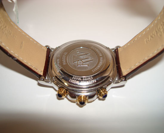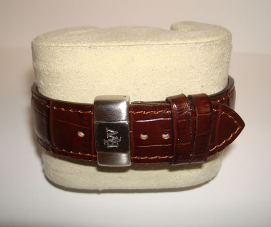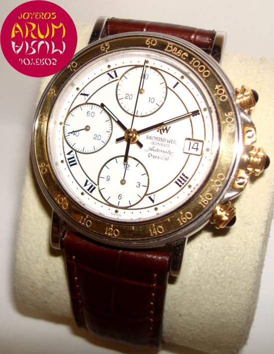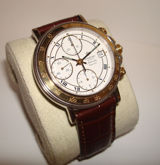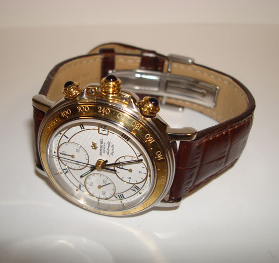Description :steel, yellow gold bezel, white dial, sapphire crystal, automatic movement, 3 indicators on the dial, seconds, minutes, hours, date at three, handles with luminescent indicators, diameter 38 mm, waterproof 50 meters, crown and pushers with stones, brown leather strap, folding clasp.