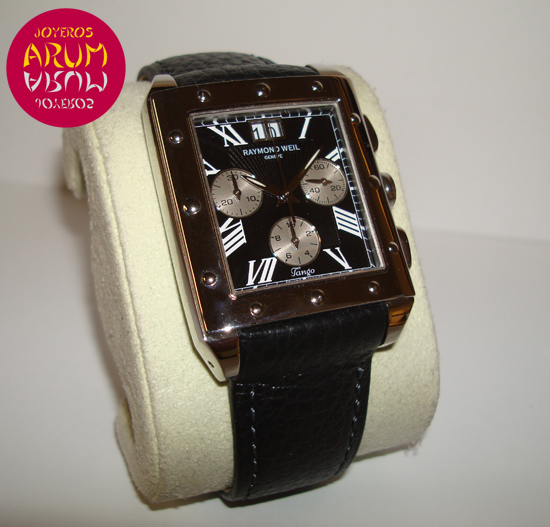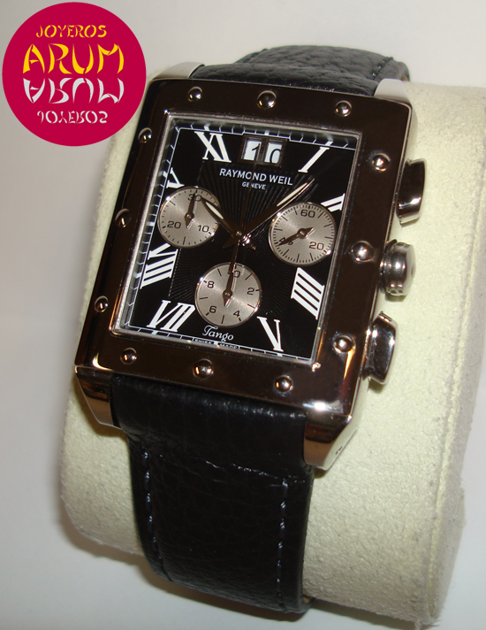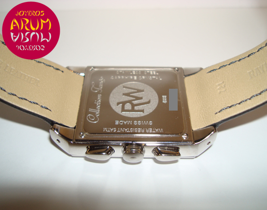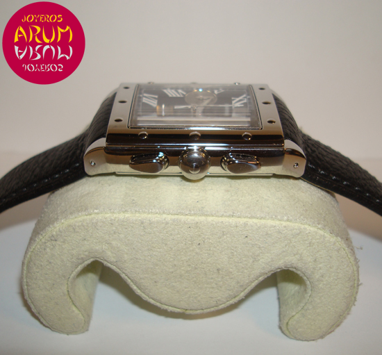 Description :steel, black dial with roman numerals, sapphire crystal, quartz movement, chronograph, three indicators on the dial, seconds, minutes, hours, double digit date at twelve, luminescence, diameter 33 mm, screw crown and two buttons, water resistant 50 meters, black leather strap, steel buckle closure.