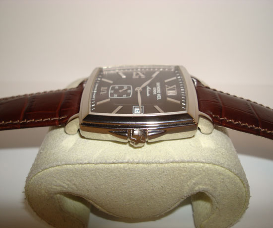 Description :steel, sapphire crystal, automatic movement, second smaller, date at three o’clock, screw crown, diameter 36 mm, waterproof 30 meters, transparent caseback, brown leather strap, steel buckle closure.