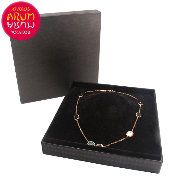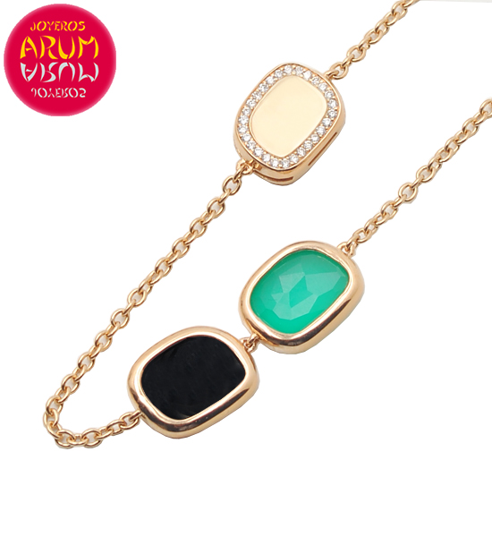 Description: Italian jewelry Roberto Coin necklace, made in 18K rose gold with diamonds, black jade, green agate and back signed with a small ruby. The large are 22 cm.