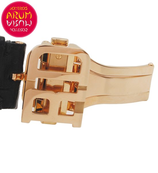 Other specifications :limited edition 28 pieces (3/28), calibre RD1439, power reserve 48 hours, 18K gold case and deployant, perpetual calendar, leap year at three, day of the week and month at twelve, date at four, moon phase. Year 2005.