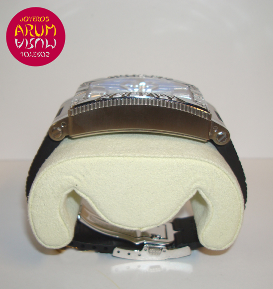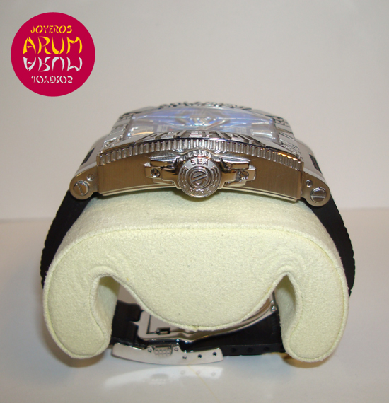 Description :limited edition 5 pieces, special edition commemorating the 150 anniversary of the Swiss Watch Union, steel case, sapphire crystal, blue dial, automatic movement, caliber RD21, luminescent numbers, protective crown, diameter 34 mm, transparent caseback , waterproof 300 meters, rubber strap, steel folding clasp, year 2008.