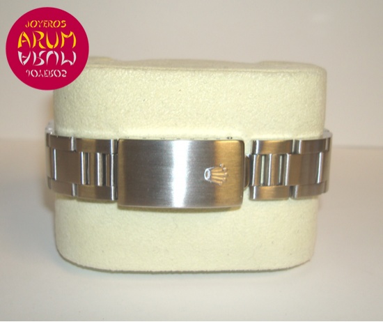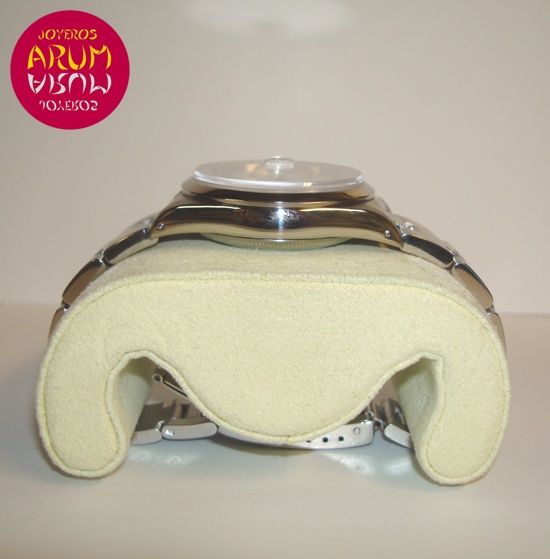 Description :steel, white dial with roman numbers, smooth bezel, sapphire crystal, automatic movement, center seconds, luminescent handles with indicators, date at three, magnifying glass on date, screw crown, diameter 34 mm, steel strap, folding clasp.