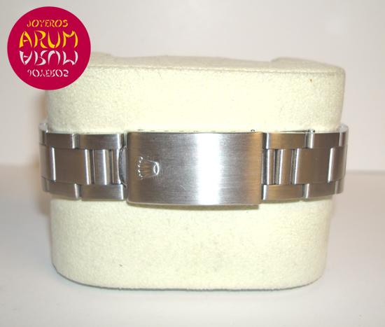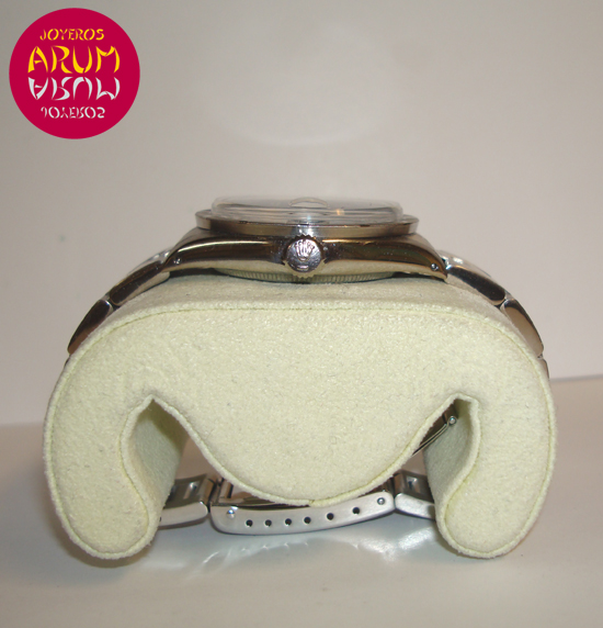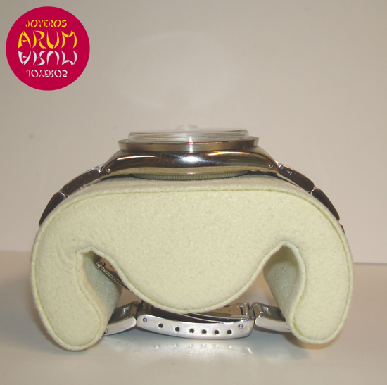 Description :steel, black dial with roman numbers, fluted bezel, plastic glass, automatic movement, central second, date at three, magnifying glass on date, handles with luminescent indicators, screw crown, diameter 34 mm, steel strap, folding clasp.