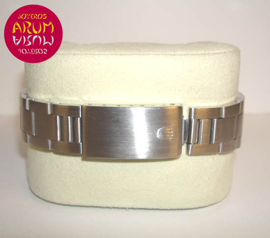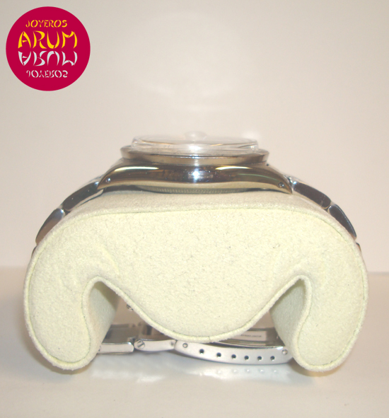 Description :steel, grey dial with roman numbers, fluted bezel, plastic glass, automatic movement, central second, date at three, magnifying glass on date, handles with luminescent indicators, screw crown, diameter 34 mm, steel strap, folding clasp.