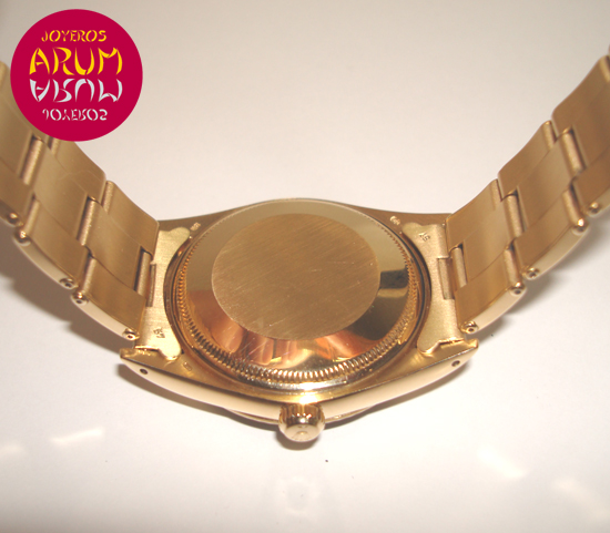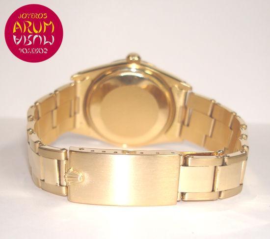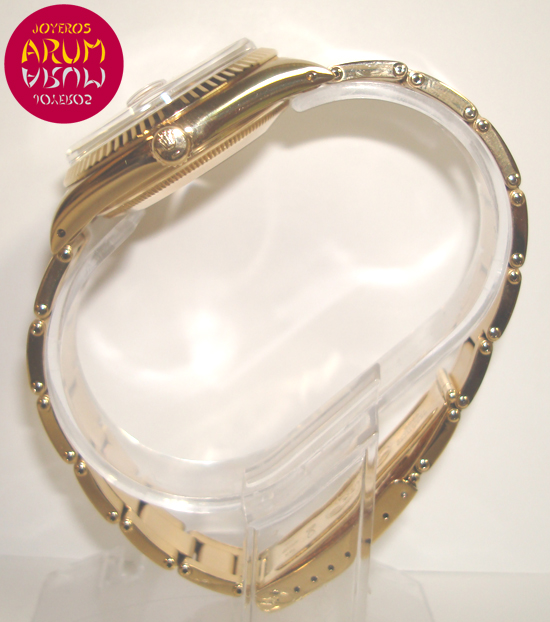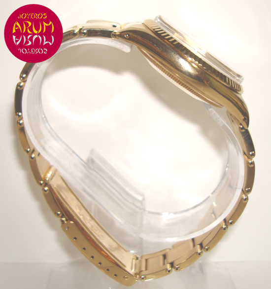 Description :yellow gold, white dial, fluted bezel, plastic glass, automatic movement, central seconds, date at three, date magnifier, screw crown, diameter 34 mm, waterproof 30 meters, yellow gold strap, folding clasp, year 1990.