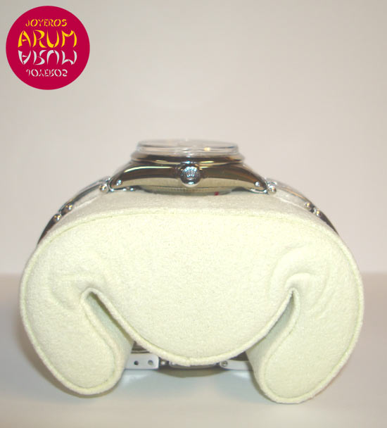 Description :ladies watch, steel, gray dial, smooth bezel, plastic crystal, automatic movement, center seconds, luminescent handles with indicators, date at three, magnifying glass on date, screw crown, diameter 25 mm, steel strap, folding clasp.