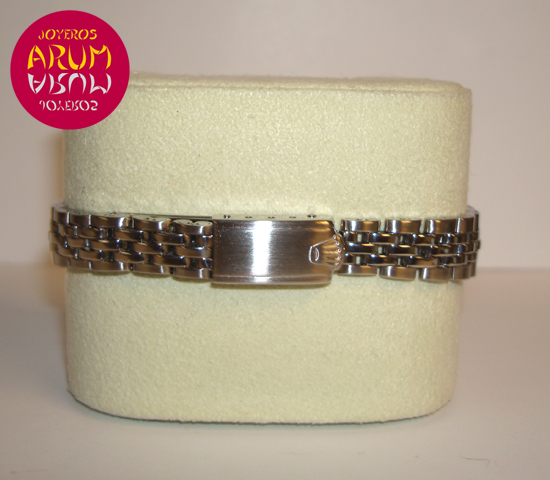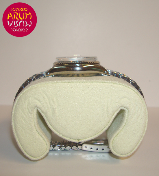 Description :lady’s watch, steel, silver dial, fluted bezel, plastic glass, automatic movement, central second, handles with luminescent indexes, date at three, magnifier date, screw crown, diameter 25 mm, water resistant 30 meters, steel strap, steel folding clasp.