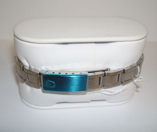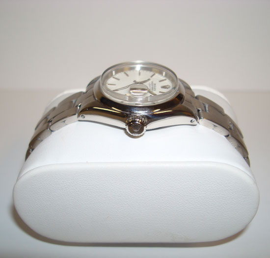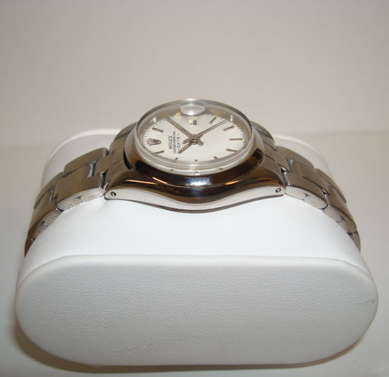 Description :lady’s watch, steel, white dial without numbers, sapphire crystal, automatic movement, center seconds, luminescent handles indicators, date at three, magnifier date, screw crown, diameter 25 mm, steel strap, steel folding clasp .