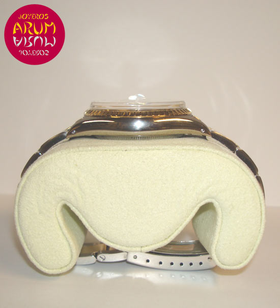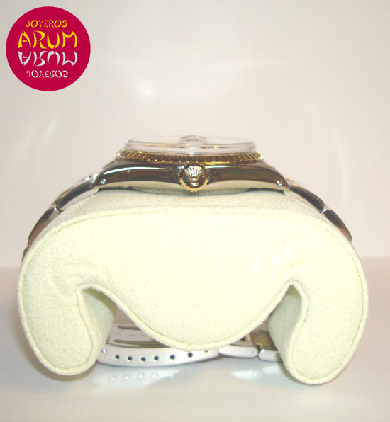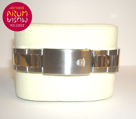 Description :steel and yellow gold, yellow dial, fluted bezel, plastic glass, automatic movement, center seconds, luminescent handles with indicators, date at three, magnifier date, screw crown, diameter 35 mm, steel and yellow gold strap, folding clasp.