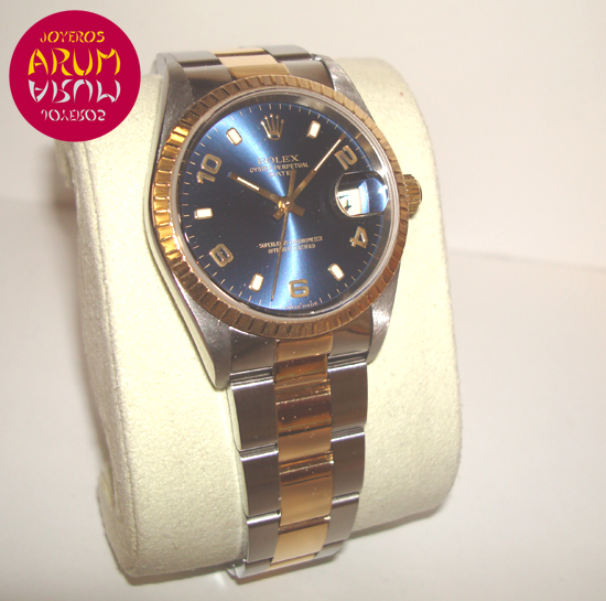 Description :steel and yellow gold, blue dial with arabic numbers, fluted bezel, sapphire crystal, automatic movement, central second, handles and dial with luminescent indicators, date at three, magnifying glass on date, screw crown, diameter 34 mm, waterproof 30 meters, steel and yellow gold strap, folding clasp.