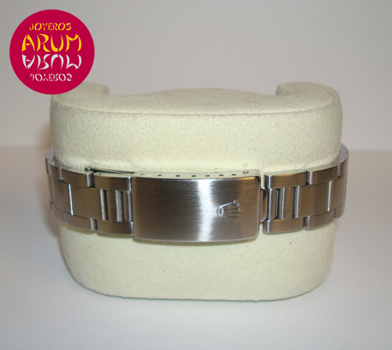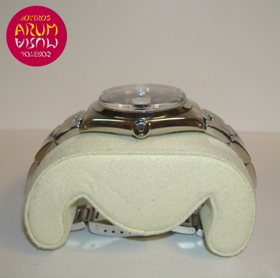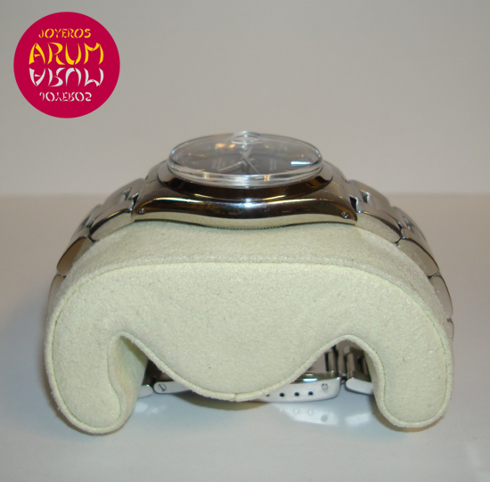 Description :steel, blue dial without numbers, plexiglass, automatic movement, center seconds, luminescent handles indicators, date with magnifier at three, screw crown, diameter 34 mm, steel strap, steel folding clasp .