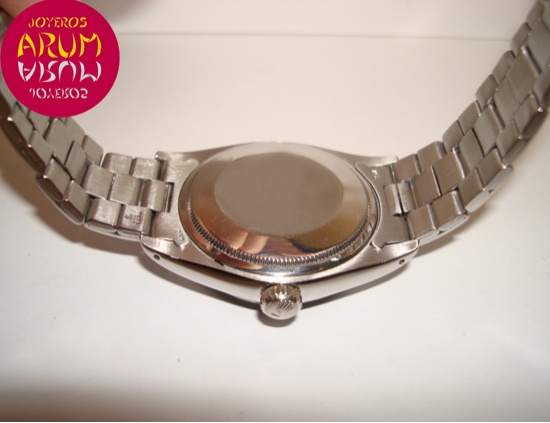 Description :steel, black dial, plastic glass, automatic movement, center seconds, luminescent handles indicators, date at three, magnifying glass on date, screw crown, diameter 34 mm, steel strap, folding clasp.