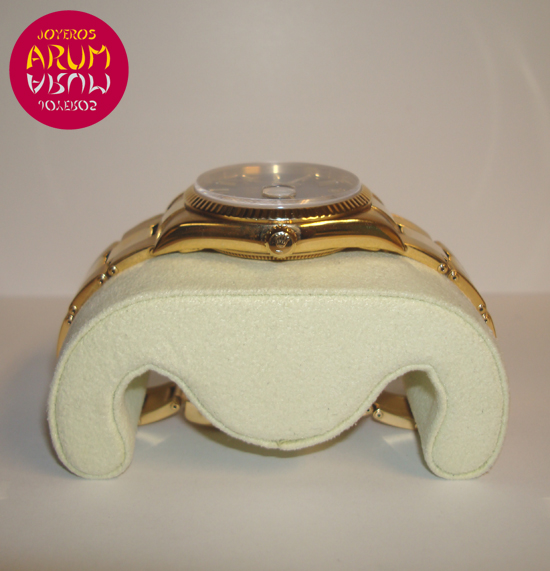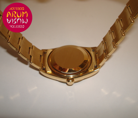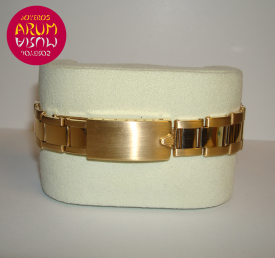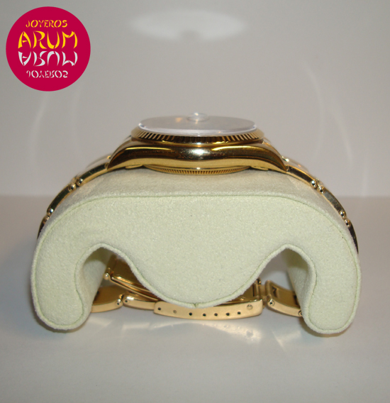 Description :yellow gold, blue dial, fluted bezel, sapphire glass, automatic movement, center seconds, handles with luminiscent indicators, date with magnifying glass at three, screw crown, diameter 34 mm, yellow gold strap, folding clasp, year 1993.