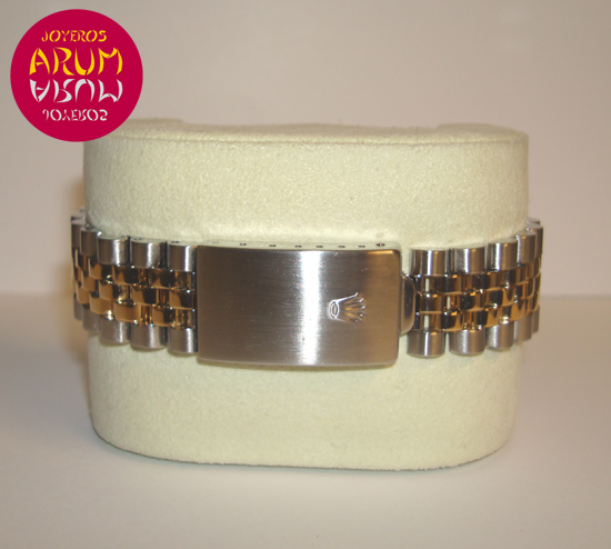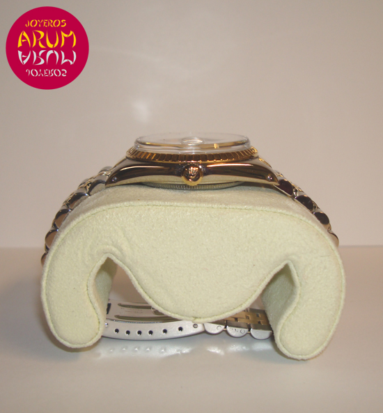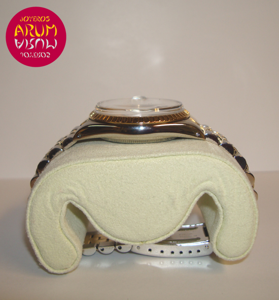 Description :steel and yellow gold, yellow dial, fluted bezel, plastic glass, automatic movement, center seconds, luminescent handles with indicators, date at three, magnifier date, screw crown, diameter 34 mm, steel and yellow gold strap.