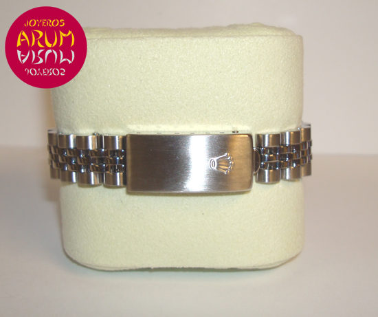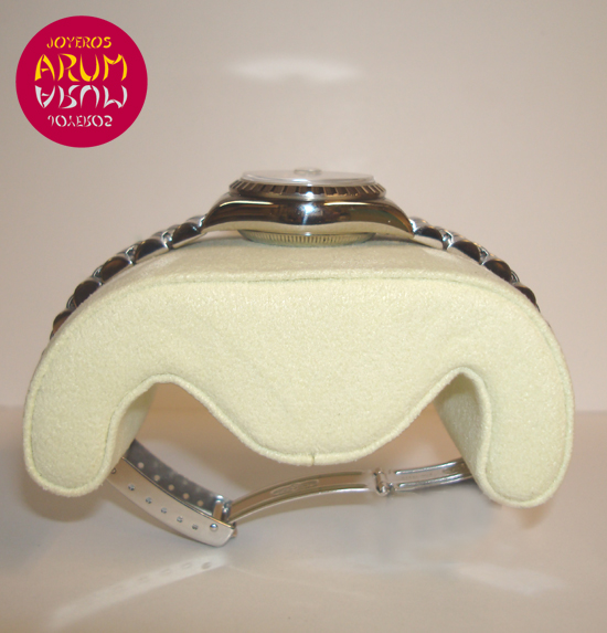 Description :lady’s watch, steel, white dial, fluted bezel, sapphire glass, automatic movement, center seconds, luminescent handles with indicators, date at three, magnifier date, screw crown, diameter 25 mm, 30 meters underwater , steel strap, folding clasp.