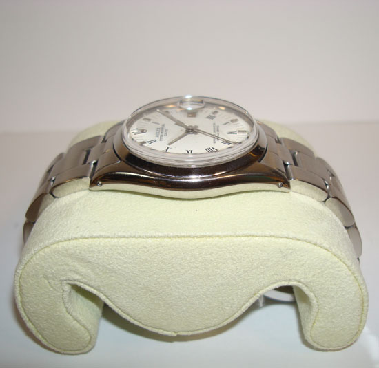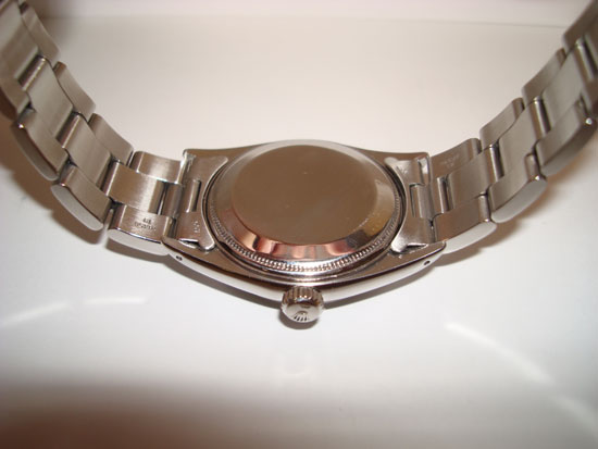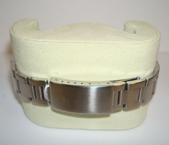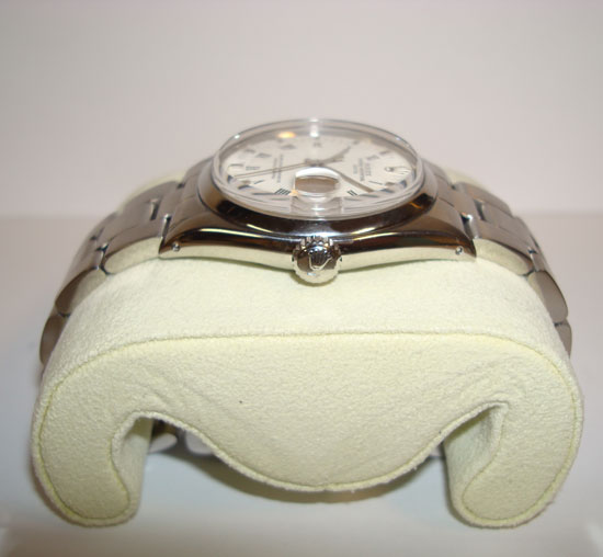 Description :steel, white dial with roman numerals, plastic crystal, automatic movement, center seconds, luminescent handles indicators, date at three, magnifier date, screw crown, diameter 33 mm, steel strap, steel folding clasp.