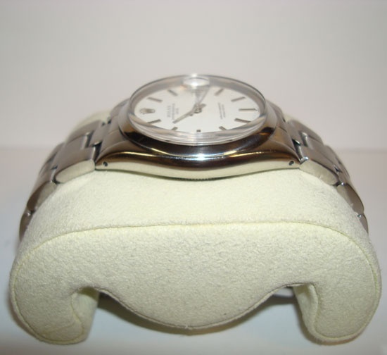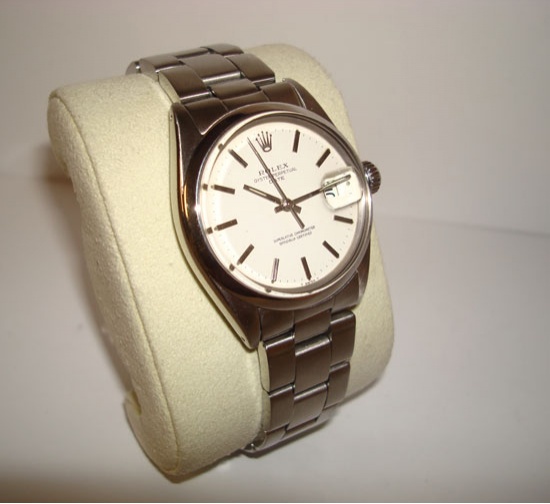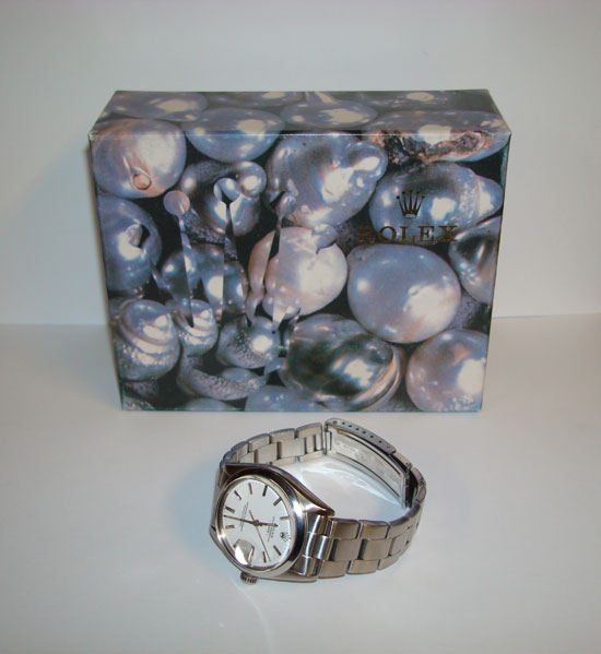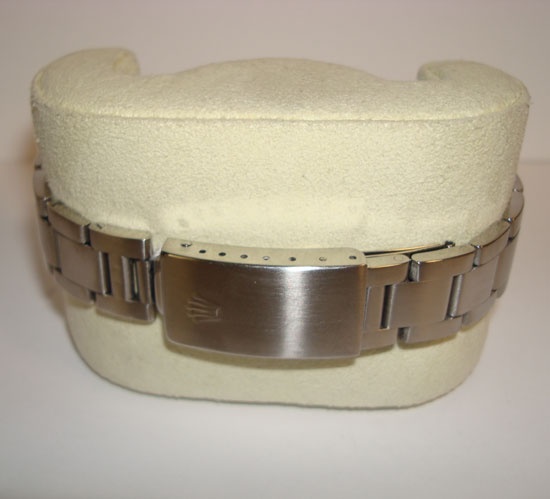 Description :steel, white dial without numbers, plastic crystal, automatic movement, center seconds, luminescent handles indicators, date at three, magnifier date, screw crown, diameter 34 mm, steel strap, steel folding clasp.