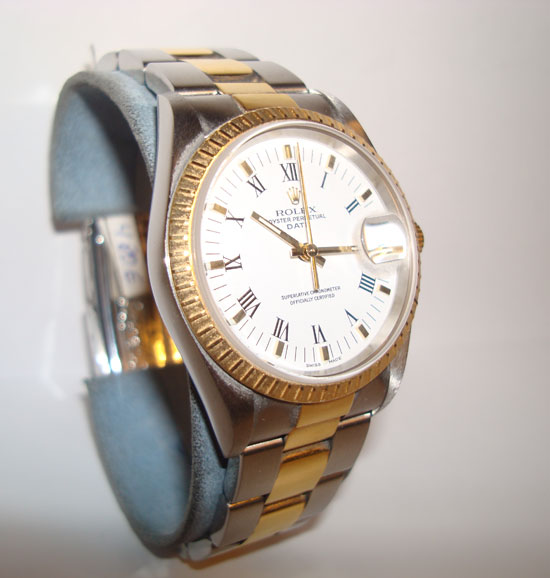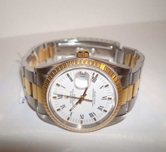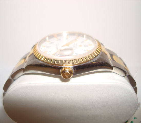 Description :white dial, roman numerals, steel and yellow gold, automatic movement, date, magnifier date, luminescent hands, screw crown with various positions, steel and gold strap, foldable closure.