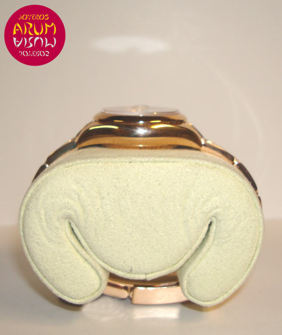 Description :ladies watch, pink gold, black dial, smooth bezel, sapphire crystal, automatic movement, central second, date at three, magnifying glass on date, screw crown, diameter 26 mm, waterproof 30 meters, rose gold strap, folding clasp, year 2003.