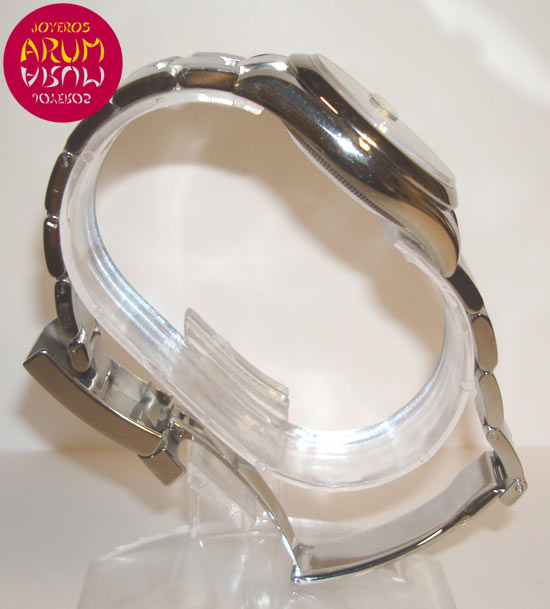Description :steel, brown dial decorated with floral motifs, smooth bezel, sapphire crystal, automatic movement, central seconds, date with magnifying glass at three, screw crown, diameter 36 mm, waterproof 30 meters, steel strap, folding clasp, year 2012.