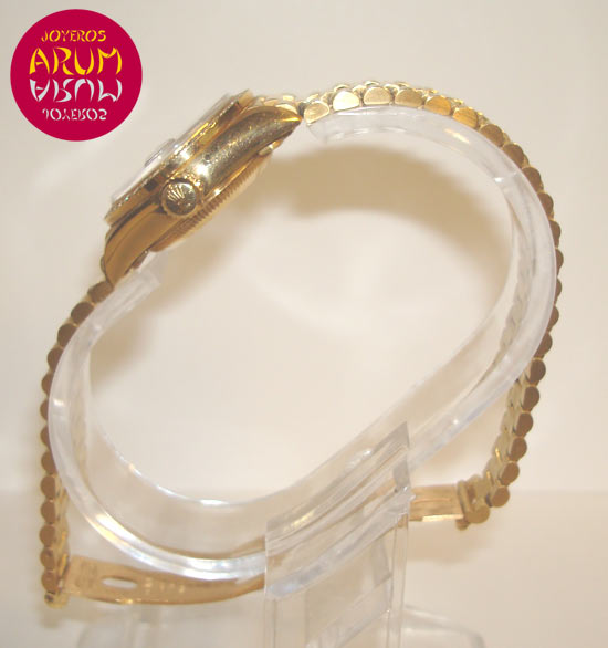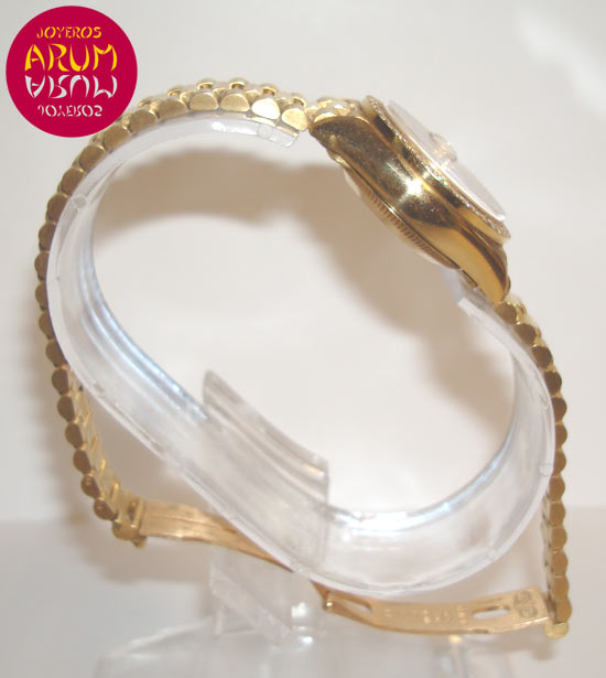 Description :ladies watch, yellow gold, yellow sphere with brilliants, brilliants in the bezel, sapphire crystal, automatic movement, central seconds, handles with luminescent indicators, date at three, date with magnifier, screw crown, diameter 26 mm, waterproof 30 meters, yellow gold strap, pink gold folding clasp, year 2005.