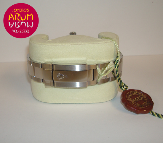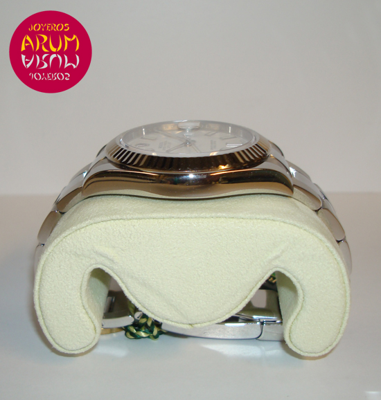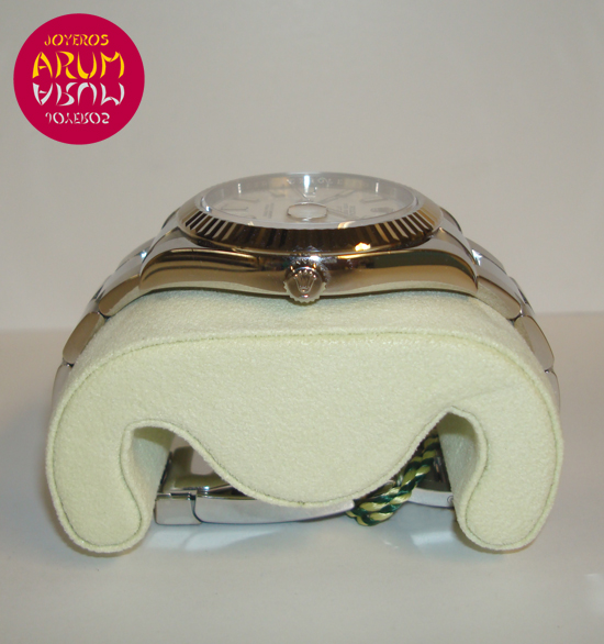 Description :steel and white gold, white dial, sapphire crystal, fluted bezel, automatic movement, central seconds, handles and luminescent dial, date with magnifying glass at three, screw crown, diameter 41 mm, steel and white gold strap, folding clasp.