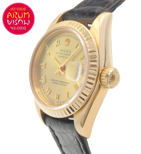 Other specifications :lady´s watch, 18K yellow gold, champagne dial, fluted bezel, central seconds, date at three, screw crown. Year 1987.