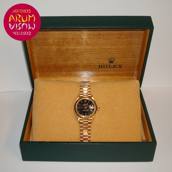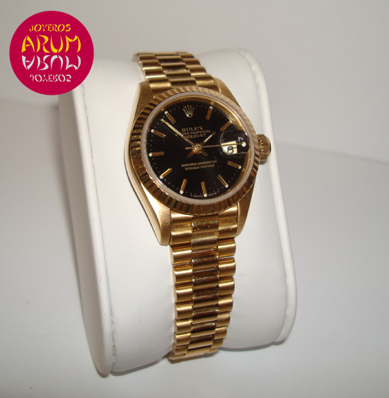 Description :lady watch, yellow gold, black dial, sapphire crystal, center seconds, luminescent handles indicators, date with magnifying glass at three o’clock, screw-down crown, diameter 25 mm, yellow gold jubilee strap, folding clasp.