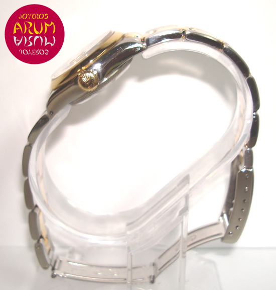 Description :ladies watch, steel and yellow gold, yellow dial, smooth bezel, sapphire crystal, automatic movement, central seconds, handles with luminescent indicators, date at three, date magnifier, screw crown, diameter 25 mm, steel and yellow gold strap, folding clasp, year 1989.