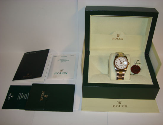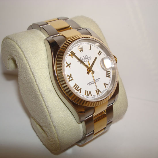 Description :steel and yellow gold, white dial with roman numerals, fluted bezel, sapphire crystal, automatic movement, center seconds, date, magnifying glass on date, screw crown, diameter 36 mm, steel strap and yellow gold, folding clasp.