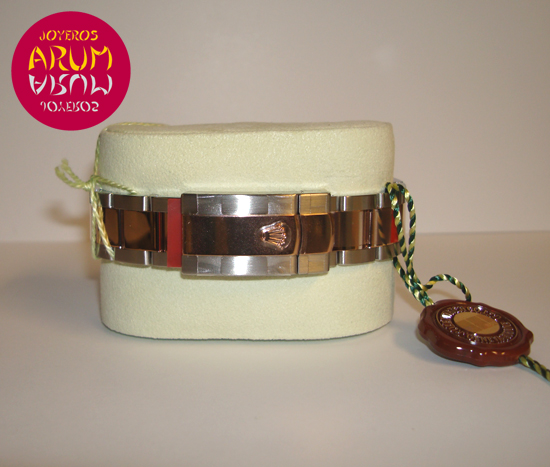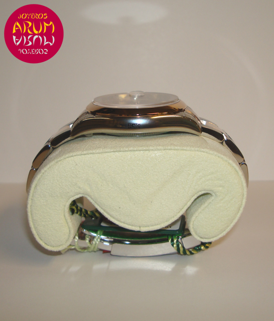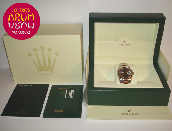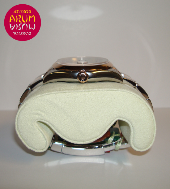 Description :steel and pink gold, gray dial with roman numbers, smooth bezel, sapphire crystal, automatic movement, central second, date at three with magnifier, screw crown, diameter 36 mm, 30 meters underwater, steel and pink gold strap, folding clasp.
