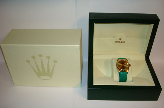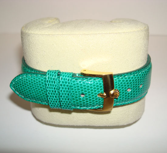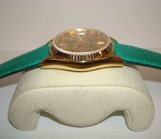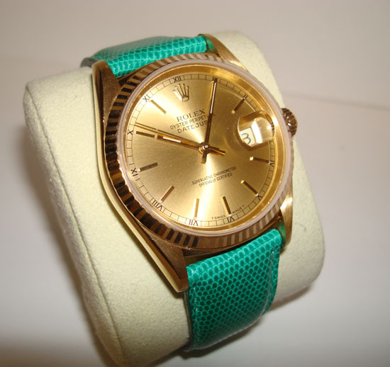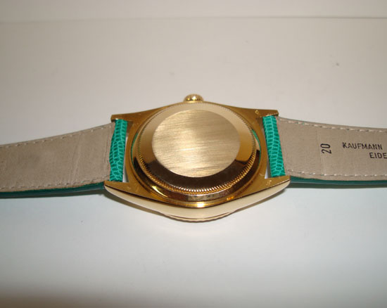 Description :yellow gold, fluted bezel, sapphire crystal, automatic movement, center seconds, luminescent handles indicators, date with magnifying glass at three o’clock, screw crown, diameter 35 mm, green leather strap, buckle closure original Rolex.