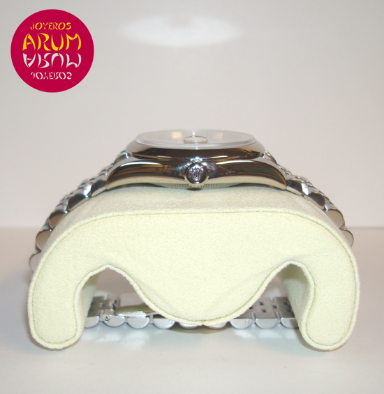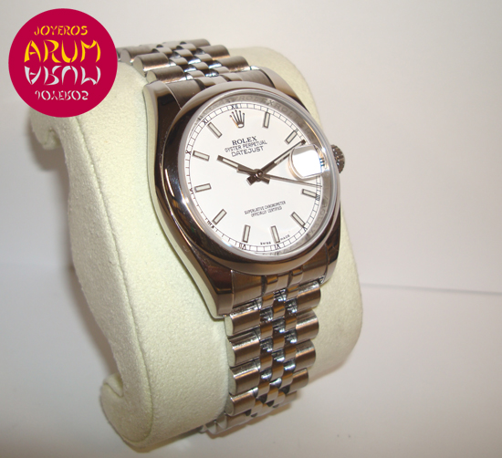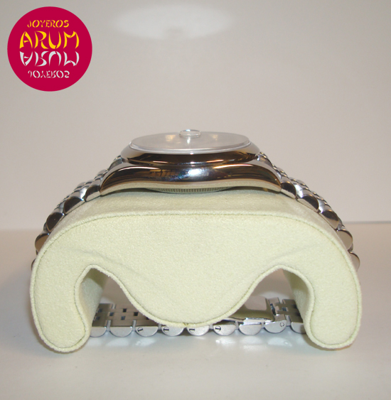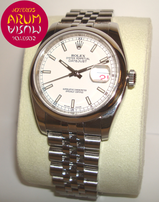 Description :steel, white dial, fixed bezel, sapphire crystal, automatic movement, central seconds, handles and luminescent dial, date with magnifying glass at three, screw crown, diameter 36 mm, waterproof 30 meters, steel strap, hidden folding clasp, year 2011.
