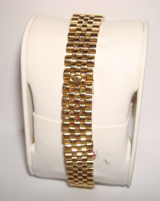 Description :Ladies watch, yellow gold, sapphire crystal, automatic movement, white dial, center seconds, date, luminiscence, screw crown, diameter 25 mm, yellow gold strap, rose gold hidden closure.