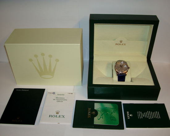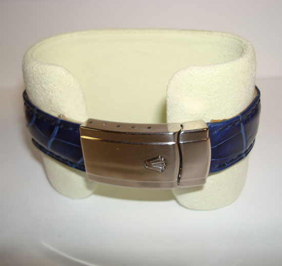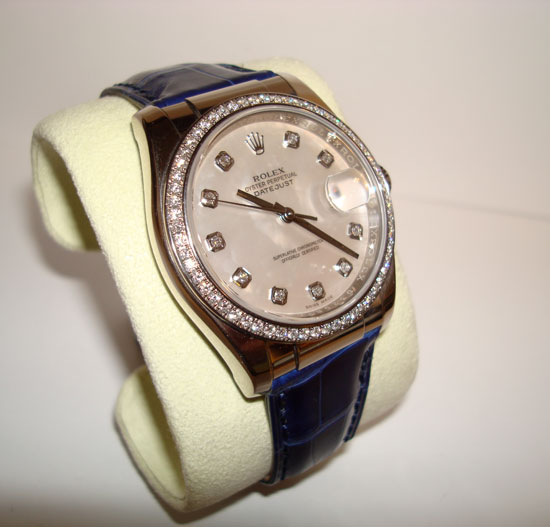Description :white gold, mother of pearl sphere, bezel with diamonds, automatic movement, sapphire crystal, dial with diamonds, center seconds, date at three, magnifier date, screw crown, diameter 36 mm, 100 meters waterproof, blue leather strap, white gold clasp.